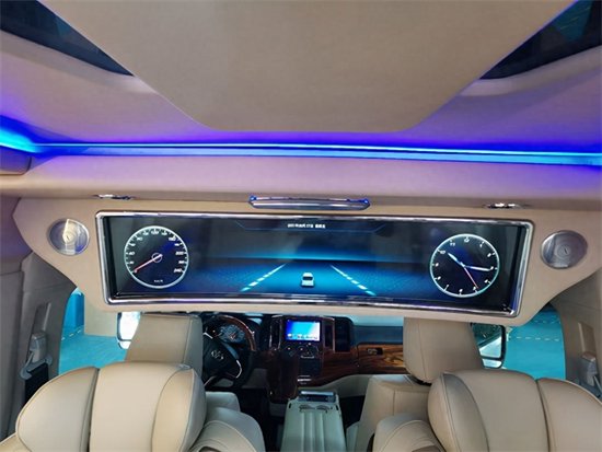 原车音响是比较简陋的,在这方面呢,升级了阿尔派音响系统,环绕声道极强,这也是作为商务车所必备的一项功能。在娱乐系统方面,24寸无线吸顶娱乐电视机带卡拉OK功能,这项配置配合着我们的音响系统,整车除了具有商务功能化,也具有了娱乐功能。