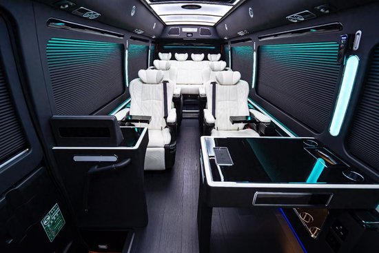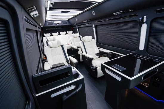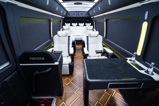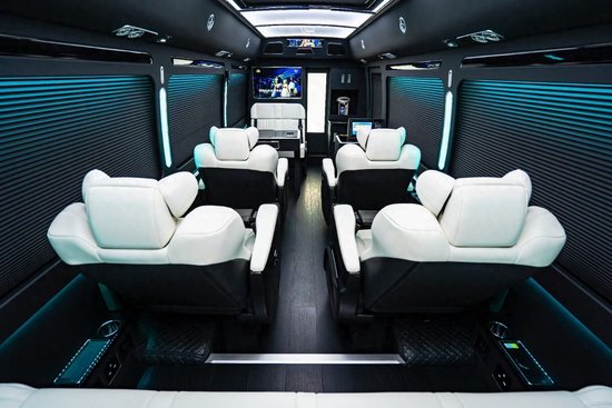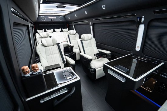 整体车内新配4张LM300同款样式座椅,黑白双拼,配有电动前后调节,靠背、腿托、加热通风,折叠小桌板,座椅后方踏板等功能。新配后方四连排电动沙发床,可以180度放平。整体来讲,12座的布局充分保证了车内的乘坐的舒适性,每个座椅一视同仁,这类型的布局最适合接待合作伙伴,接待领导,可以全面的顾及到乘坐者。地板用的是豪华游艇木地板,更高级还可以铺设地毯。