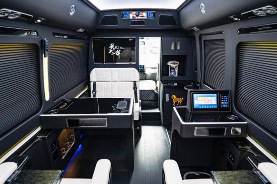 车内整体选配的是黑白配色,两个高档办公桌,带有双侧抽屉,纸巾盒,水杯托,无线充电板,桌板上放文件,放电脑,老板开会,或者点歌都是可以的。因为旁边小一点的秘书桌,带有抽屉,水杯托,无线充电板和点歌台。车内72色氛围灯以及空客A380顶灯,白光,彩光可以随意调节。整个车内都是电动窗帘,带有阻燃,耐高温,防紫外线的特征,而且还是进口布艺,窗框是定制一体式翻毛皮包覆桃木装饰。连侧墙都是模具化,翻毛皮包覆,交织皮纹工艺包覆,还有定制的空调风道以及出风口。