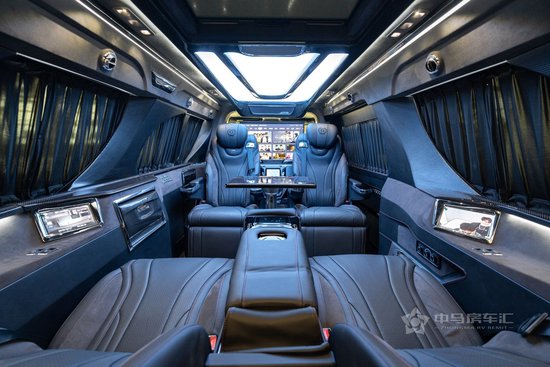 后舱半隔断环抱式航空头等座舱设计,定制首长级座椅,拥有一个32寸高清液晶屏半隔断只能吧台。32寸的显示屏为电动可升降式,既能保证空间的通透感,又能兼顾后舱的保密和隐私感。液晶屏下的吧台设置了隐藏式电热水壶,前后舱双独立车载冰箱。