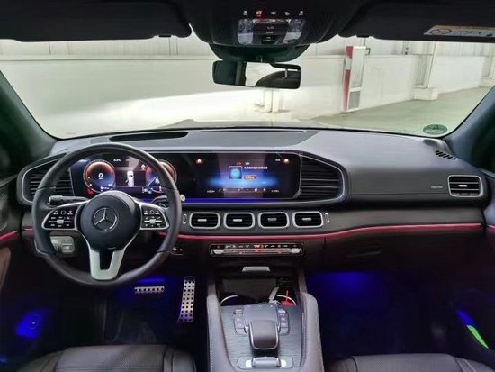 23款柴油奔驰全新GLS (配置|询价)350d内饰采用了最新家族式布局,双12.3英寸液晶屏,有效地提升了内饰的科技感与豪华感,值得注意的是,搭载了全新的MBUX系统,取代原先的Command Online系统,MBUX 可以透过手写、语音操作、以及触控面板来进行操作;三幅式多功能方向盘,周围覆盖了钢琴烤漆与银色镀铬,空调造型为方形设计,面板装配了贯穿式银色镀铬饰条,提升了内饰的金属质感。
