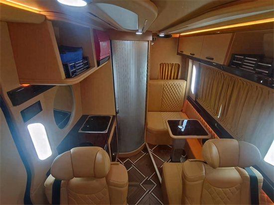 豪华真皮座椅可以前后、左右调节、加热、电动按摩,同时可以调节靠背、腿拖等。德国进口三折手动沙发床,座椅与大床之间切换自如,操作简单,豪华大床的真皮触感舒适,营造良好的车内休息睡眠环境。