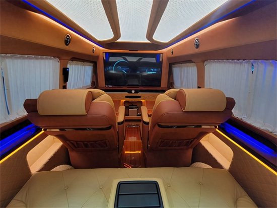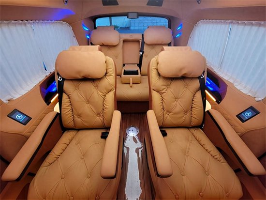 后排座椅支持180度平躺;为您的长途出行打造临时床铺奔驰V260L七座版改装商务车高顶隔断礼遇版,七座车型的第三排沙发,支持一键放平或者收起,随时为您的长途出行打造足够宽敞舒适的卧铺,简约时尚的氛围灯与豪华柚木地板交相辉映,是对精致移动生活的皮质追求!