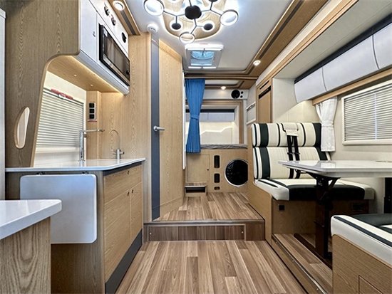 车门右侧设计有小玄关,可以用来放置一些小物品,方便上下车拿取,下方则可以当作鞋柜使用。区域内还配置了房车的水电管理控制面板,隐藏式设计避免孩童误触产生危险。车门上方配置了一台三三菱1.5P直流变频 静音节能空调,配合车内装配的卡洛西行车冷风以及伟巴斯特驻车燃油暖风,为出行生活创造一个恒温静谧的舒适环境。厨房区厨台上只配备了洗菜池,标配可移动式电磁炉,不使用时可以收纳起来不占用空间,隐藏延伸桌板随抽随用。同时设计了多个储物空间,车内车外共用双向抽屉方便内外使用。