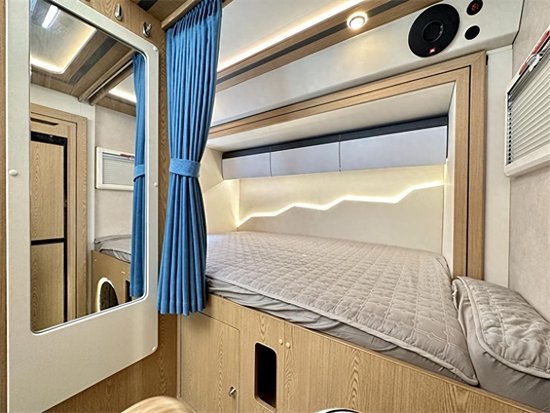 以额头床+中置4人会客区+中置厨房+车尾拓展床位+卫生间为基础格局,在个别家具饰面上进行微调,比如厨房区和卫生间门板位置大量使用了白色和浅灰色的饰面装饰,视觉上更显明快开阔。额头区域是双层PVC结构,内部整个包覆的是菱形软包。这张额头床的最大尺寸为2180×1500(mm),额头床入口最大高度650mm,床位尺寸足够大,入口高度表现一般。