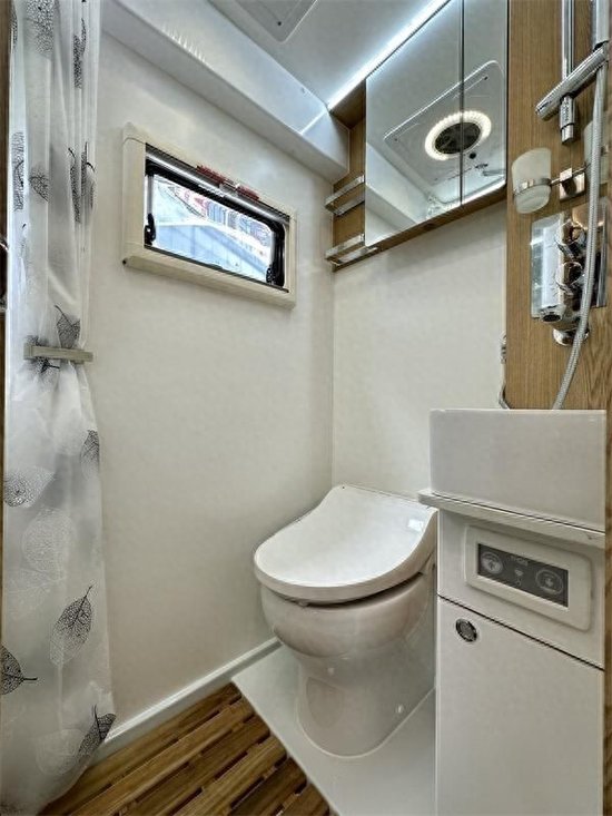 卫生间部分在全新E途pro max上依然很熟悉,酒店式卫生间,匹配智能马桶、MAXX换气扇、顶部储物柜、侧窗、独立淋浴系统,尤其是带有固定的洗漱台和洗脸盆,而这一切设备也是当前C型房车中算的上最豪华的配置了。车辆的水路配置也堪称豪华:330升保温双净水箱+80升保温灰水箱+90升黑水箱,超大水路保证优秀自持力表现。