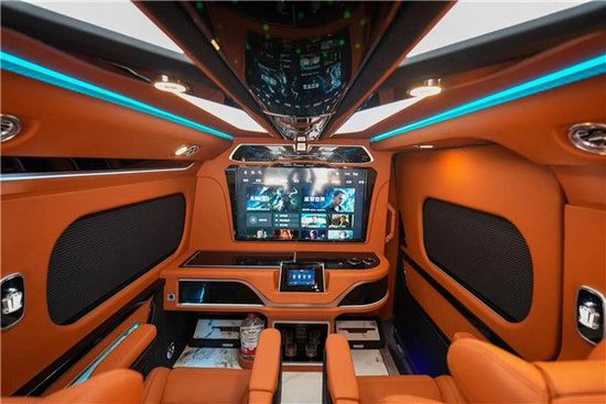 丰田海狮整车升级了加强型的隔音隔热处理,车内带空气净化系统,无线充电系统。在进门侧加装了氧化铝脚踏带迎宾灯的,华通丰业整车都是采用纳帕级皮质进行包覆的,侧壁红木装饰,手动百褶窗帘,后舱暖风系统,最后说说棚顶灯光,这个有智能触摸控制系统。灯光超级棒。