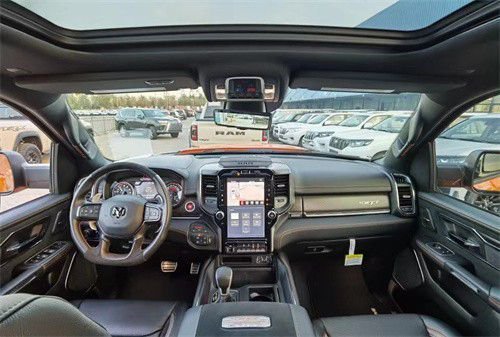 全新23款道奇公羊霸王龙TRX在内饰部分进一步强化了其高性能版本的形象,中控台和座椅随处可见的TRX标识便是最好的例证。同时,作为道奇家族的旗舰车型,新车还配备了12英寸竖置中控屏幕,除了支持蓝牙、导航和车载Wi-Fi等常见功能,还支持Apple CarPlay和Android Auto手机映射。