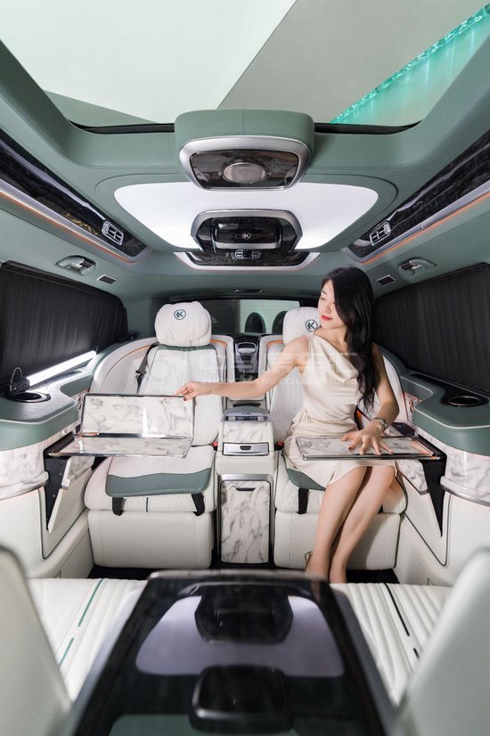 克蒂翔翼MH9奔驰商务车打开电动侧滑门,翔翼浮雕内饰设计,将隔断、立柱、内顶环舱配合外观包围的同设计语言,体现环抱之意。三色顶灯:琥珀黄、冰晶蓝、极光白三色切换。星空卷帘:368颗手工缝缀七彩光纤,繁星似锦,四种模式随意切换。并可提供12星座、12生肖个性化定制服务,与众不同。吸顶镶嵌式控制台,设计灵感源于飞机驾驶舱,体现操作的科技感,方便乘客操作,简单而高级。为了保障车内人员的隐私,不仅有隐私玻璃,更有电动窗帘环抱一周。