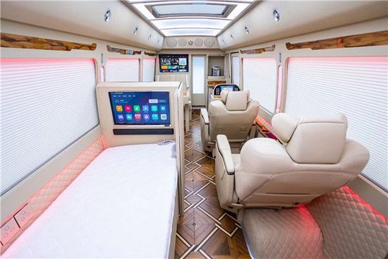 丰田考斯特(柯斯达)超VIP至尊高端定制版,该车配备了全亚洲最好的航空座椅(日本原装埃尔法 (配置|询价)座椅),除此以外,华通丰业丰田考斯特(丰田柯斯达)还在舒适性上做了一些实用的配置,如双层(中空)隔热玻璃,丰田考斯特在灯光和车厢氛围方面做了巨大的改善,全车都使用LED灯光,地毯灯,阅读灯,立柱等,航空顶灯,台阶灯,窗帘灯等灯光效果的搭配让丰田考斯特呈现给乘客更加绚丽的色彩。