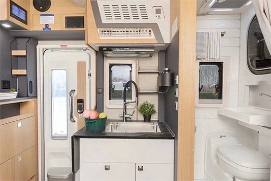 厨房位置,配备水槽,水龙头。该车水龙头是三水水龙头,将冷水、热水和纯净水这三个功能集于一体,在减少空间的同时,可以满足乘客使用的便利性,并且可以多项调节。水槽下方配备储物柜,提高整个车内空间的利用率。还有大宇微波炉,赛特福德142升车载冰箱,容量大可以储存三到四天的食物量。