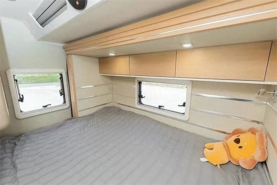 干湿一体式卫浴区配备了淋浴花洒、毛巾架、浴室镜、卫浴帘、洗手池、晾衣杆、穿衣镜、扶手、置物架等,卫浴、洗漱设施非常齐全;内部还有一台3kg洗烘一体机,解决旅行的洗衣问题。尾横床可拓展,拓展后尺寸为2210x1360mm,侧面阅读灯、电源插座、USB接口、车窗配备齐全,营造舒适的睡眠空间;顶部还有一排吊柜,提供充足的储物空间。