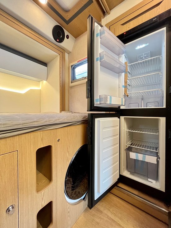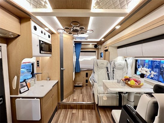 整车有三套控制系统,一套是集成式控制盒,一套是分散式的开关按钮,一套是平板APP控制系统,适用于不同的场景来用。车内的三菱重工1.5p节能变频空调,制冷制热除湿效果都非常好。行车则有进口的卡洛西空调。厨房区域,进口的微波炉,储物柜,洗菜池,延伸板,还配有一个便携式的电磁炉,在车内做个简餐还是很不错的。