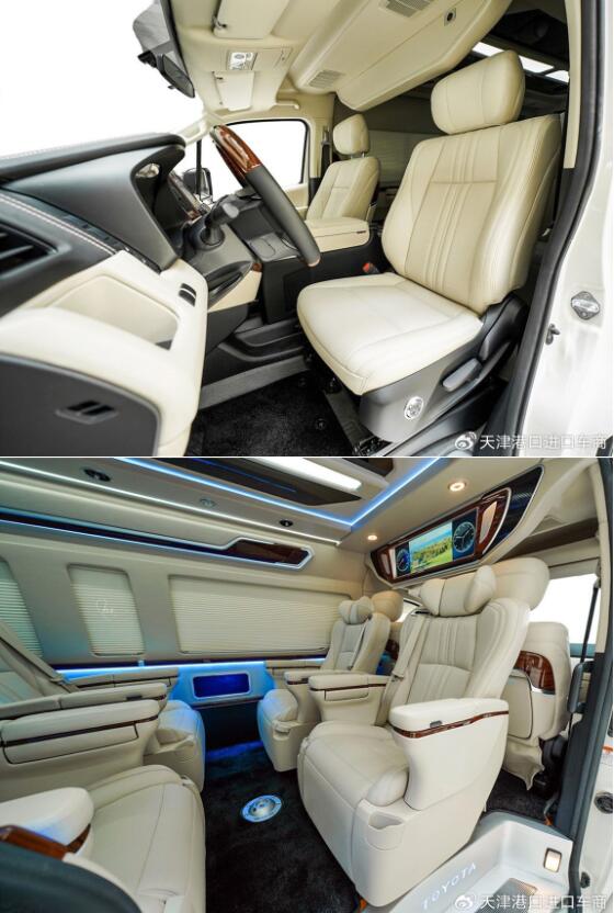 丰田海狮整车(升级了加强型的隔音隔热处理,车内带空气净化系统,无线充电系统。在进门侧加装了氧化铝脚踏带迎宾灯的,整车都是采用纳帕级皮质进行包覆的,侧壁桃木装饰,手动百褶窗帘,后舱暖风系统,最后说说棚顶灯光,这个有智能触摸控制系统。灯光超级棒。