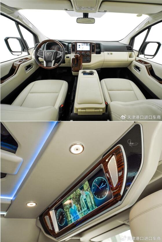 丰田海狮车内搭载42寸高清液晶电视,高级吧台配有液晶触控屏调节车内操作,吧台同时配有隐藏秘书座椅,让商务生活更充实。车顶设计浩瀚星空顶氛围灯,灯光多色可调。整车内饰车窗选用高级麂皮绒窗帘,柔软舒适。