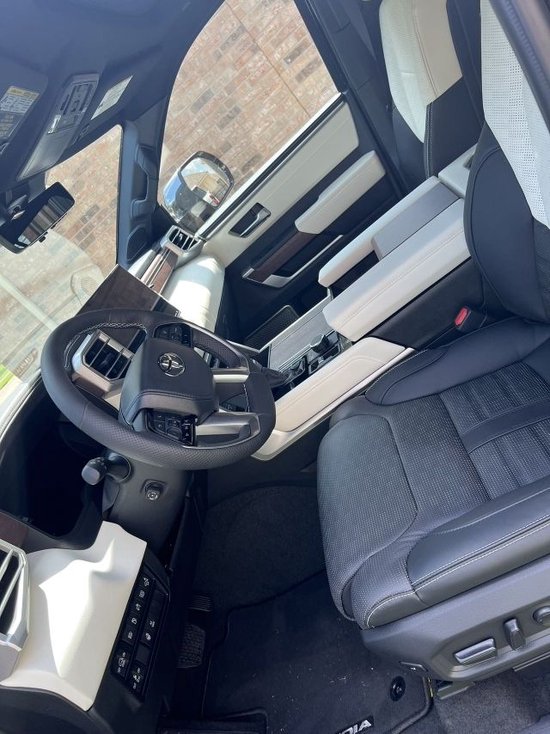 23款丰田红杉四辐式多功能方向盘、并保留了很多物理按键、足以满足驾驶时想要的操控感、车内的科技氛围是通过12.3英寸的全液晶仪表盘和14英寸的中控屏来实现的、 中控屏两侧的空调出风口、虽然没有采用时下流行的贯通式设计、但在中控台上对称排列也别有一番风味。