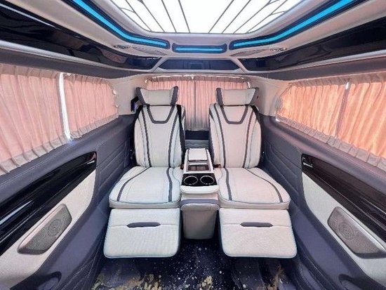 进口奔驰V250改装新款奔驰V250分别有哪些款式:奔驰V250平顶无隔屏七座,奔驰V250平顶有隔屏七座,奔驰V250高顶无隔屏七座,奔驰V250高顶有隔屏七座,奔驰V250平顶四座,奔驰V250高顶四座。每款奔驰V250凭借行政座椅,前排乘客侧的后排乘客即使在长途行车中也能够完全放松。仅需按下一个按钮,便可将座椅设置到舒适的角度,最大倾斜角度为 43.5 度。一个附加的伸出式腿部支撑进一步增强了舒适性。