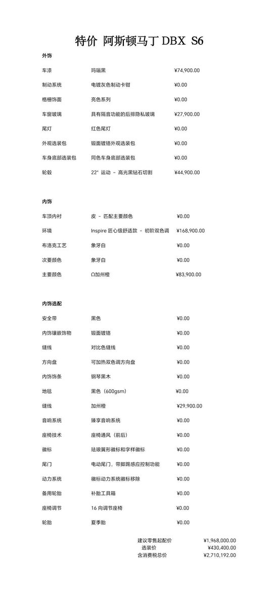 车身 五门车身设计,2+3座椅布局挤压铝合金和铸铝,连续热粘合成型单体车身车铝制复合材料车身面板全景玻璃天窗隔音夹层风挡玻璃和前排侧窗双LED前照灯,带AHB自动远光辅助功能、日间行车灯、位置灯以及锁车氛围灯。LED日间行车灯,集成了转向灯和侧气帘进气口蚌壳式发动机罩六叶片镀铬全金属格栅,配有手工镀铬黄铜和珐琅阿斯顿·马丁徽标(前、后)“天鹅翼”无框车门和电动尾门经典全宽LED尾灯,带主动式停车尾灯、指示灯功能和高位刹车灯。