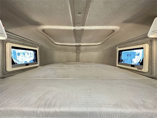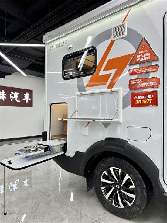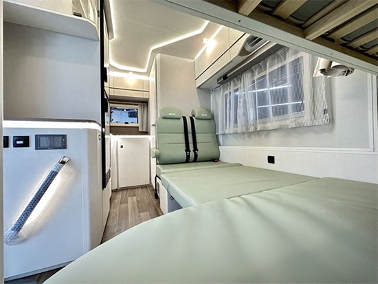 会客区采用对卡座的设计,由于这款车是四座版车型,在行车过程中只有两个正向座椅可以乘坐,对向的座椅则是在驻车时才能使用。按住餐桌边缘的开关就可以降低餐桌与卡座拼成床用于休息。厨房区域采用L型布局,抽油烟机,电磁炉,洗菜池等都是配齐的。搭配上150升的冰箱足以储存您出行所需的食材。下方则是一个和尾部厨房相通的储物柜,在车内拿取比较方便。