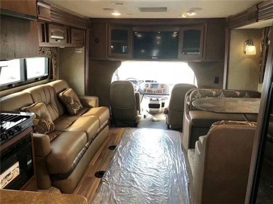 福特E450房车来自美国房车制造商Jayco房车公司,属于自行式C型房。它的外观整体造型大气浑厚,内饰奢华不已,且车厢可做电动扩展,还配备了遮阳棚,可以遮挡烈日或连绵的阴雨,让您随心所欲的与大自然亲密接触。净水箱容量118升,内设4000瓦燃油发动机,保障充分的水电供应。车内空间约24平米,宽敞舒适,丝毫无狭小压迫之感。其车长9.6米,宽2.5米,高3.5米,车身重量6.37吨,动力上搭配6.8LV10发动机,功率为422kw,油箱容积为250升。福特E450房车的前部、两侧、尾部均有外推式中空玻璃车窗,具有很好的通风性,同时还有一定的遮雨作用。