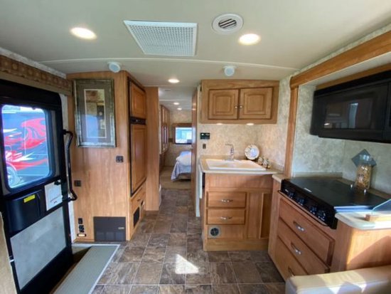 四驱福特E450房车客厅的后半部分为厨房区域,配有精美的炉具,微波炉、冰箱,洗菜池、灶台、冰箱、油烟机等常用厨房电器配置一应俱全。