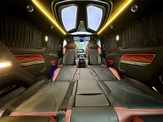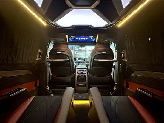 商务舱整体的装饰还是很豪华,细节之处都能体现整车的质感。在内饰颜色上,主要以黑红双拼配色,当然,其他的不同选择也是可以根据自己的喜欢进行私人定制的。图中为深邃摩卡款。顶部重新打造的是高达顶灯,多色可以调节,更稳定,抛开了花里花哨的装饰,更多的是稳重大气为主,彰显着商务车的用途和细节。