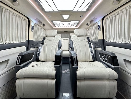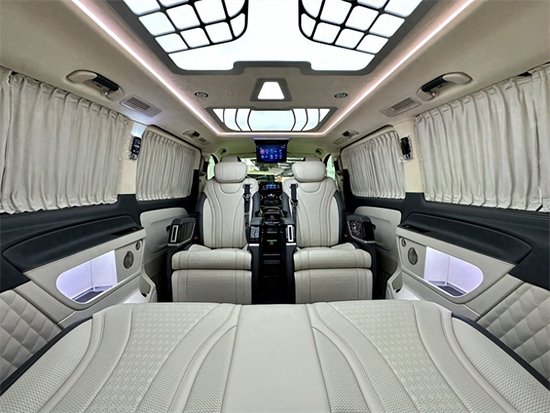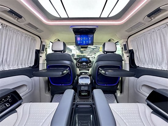 新款奔驰威霆平顶7座商务车采用了全新三幅式设计多功能方向盘,加装nappa真皮包覆,以及大量的高光橡木点缀,全车的座椅和内饰皮革采用的都是进口头层牛皮,保证了隔音性观赏性以及舒适感。中控部分采用奔驰V~Class的悬浮式中控大屏、巴赫钟表、车载冰箱等豪华配置。彰显着其奢华与舒适。