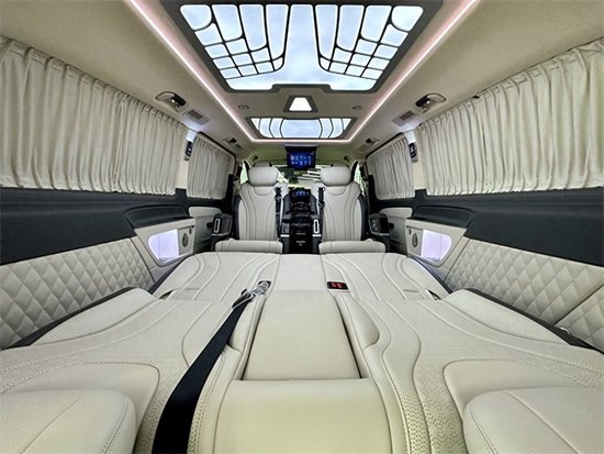 奔驰威霆平顶商务车其外观采用了奔驰AMG的外观套件,大量镀铬件点缀装饰,黑白相间,层次分明,整车质感非常出众,时尚又大气。品质工艺都是一流水准,拥有着豪华霸气的超强气场。 今天介绍这款新款奔驰威霆展厅刚刚到的,从里到外面全部更换的一款奔驰威霆顶配双开门版,车身长度5370*宽1928*高1880*,让您花低的价钱来享受一台最高端的奔驰威霆商务车,也绝对有面子。