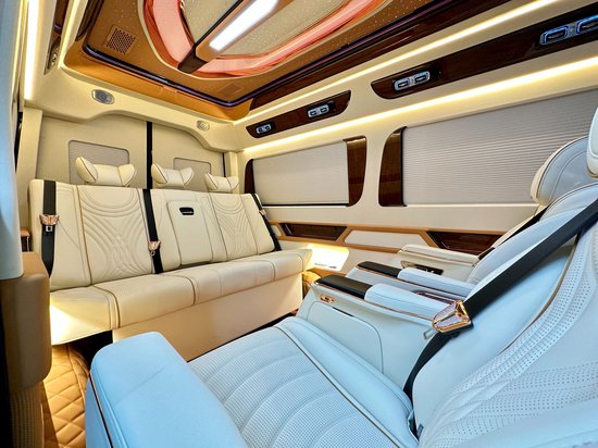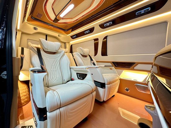 全新的奔驰斯宾特内饰升级版,那不得不提后舱两张豪华航空座椅,依据亚洲人身体形态定制而来,全部采用进口小牛皮包裹,填充物十分柔软。手枕处更选用了更为珍贵的鸵鸟皮皮质,天然的圆点与细腻的皮质给乘客足够的舒适感。靠背上装饰有“寸金寸锦”的云锦装饰,美若云霞!功能上航空座椅配有多向调节、加热通风、舒适腿托、电动电脑桌配套等高等级座舱实用功能。后排沙发床也可以随时电动放平,让车主享受旅途也享受生活。