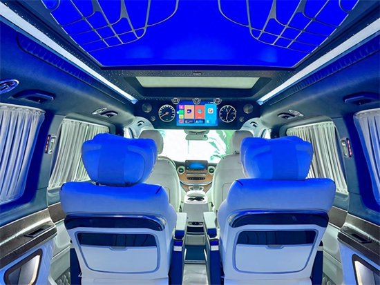 本台奔驰威霆也是应有尽有打造一台高端商务。 全新奔驰威霆改装高顶七座商务车的灯光设计,也是映入视野采用六宫格顶灯和星空顶灯搭配,光纤氛围灯营造宁静安宁的休息气氛。