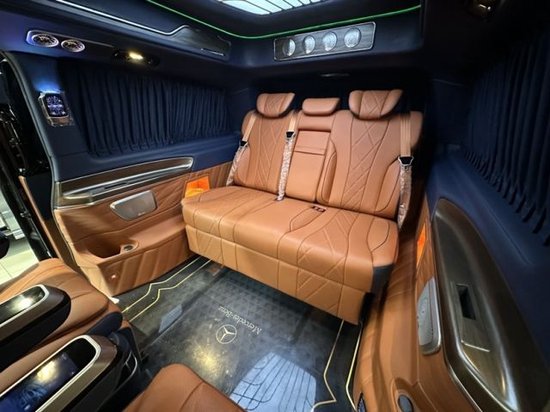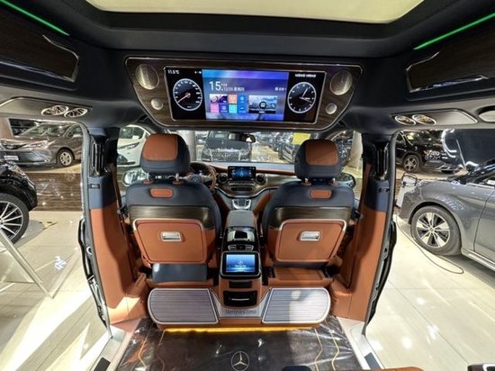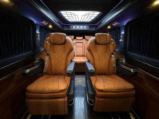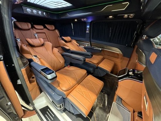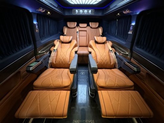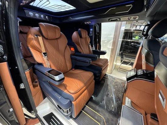 奔驰V260L改装后排座椅采用两个迈巴赫62S首长级座椅,带加热,按摩,通风,一键式电动调节记忆等功能。奔驰V260L改装高顶隔断商务车座椅符合人体工程学设计,同时带有电动椅背调节,电动头枕,电动前后调节,一键式伸缩腿托功能,带来头等舱级舒适体验,私家客厅级后舱体验。