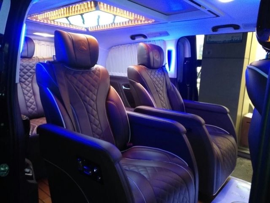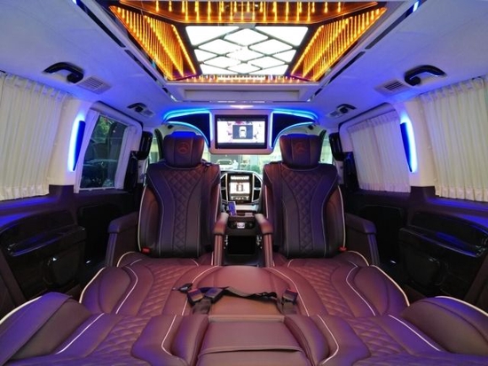 奔驰Metris2.0T 汽油[维特斯][长5141mm、宽1928mm、高1910mm]:黑色车身咖色内饰、2.0T涡轮增压缸内直喷汽油发动机,7速手自一体双离合变速箱怀挡设计带换挡拨片,7座位,12.1寸巨屏中文导航带后置摄像头,自动感应大灯,电动调节后视镜,变道提醒系统,疲劳提醒,发动机自动启停系统,3种驾驶模式,中央扶手箱带内置冰箱,全新升级正副驾驶席6向电动调节座椅,第二排通风加热按摩电动可旋转航空座椅,第三排电动可放平沙发床,双侧电动滑动门带防夹功能,后掀尾门,高级氛围灯,迈巴赫顶灯,吊顶19寸液晶电视,游艇级防火柚木地板,进口豪华窗帘,小桌板,天窗,行李架,光亮式脚踏,进口德国马牌轮胎,全新升级版全车镀铬套件及17寸铝合金轮毂。