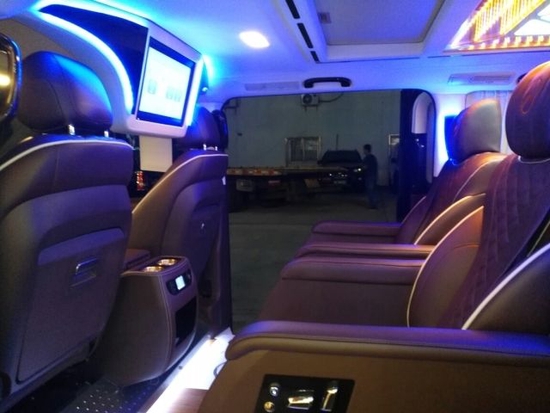 奔驰维特斯房车内部车舱的奢华和时尚感,除了是甄选饰材选料的装饰效果,还有一份灯饰照明的功劳。房车车顶棚采用麂皮绒包覆,两边氛围灯饰带环绕,中部迈巴赫宫格顶灯和奢华级星空顶灯组合,灯照效果异常通透明亮,富丽堂皇的皇家宫廷环境,更显得房车自身品质的尊贵和其高端商务气质。