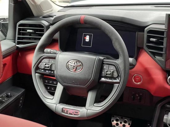 23款丰田红杉四辐式多功能方向盘、并保留了很多物理按键、足以满足驾驶时想要的操控感、车内的科技氛围是通过12.3英寸的全液晶仪表盘和14英寸的中控屏来实现的、 中控屏两侧的空调出风口、虽然没有采用时下流行的贯通式设计、但在中控台上对称排列也别有一番风味。