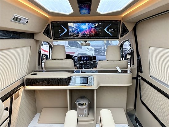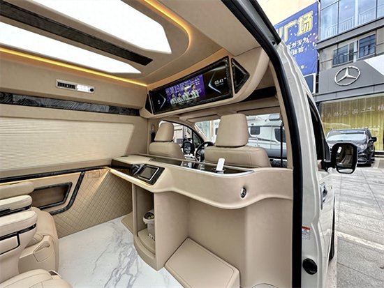一般这个区域都是定制一个可拆卸的小桌板以供休闲娱乐,今天这台车在这里定制一张车载麻将桌,这可是非常少见的哦!也就是说,这是一台可以打麻将的私人定制版,不知道车主是有多喜欢打麻将啊。吧台位置还有一台车载烧水壶,这样一来麻将、茶水都齐活了。。。。。。好
