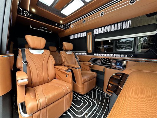 后方布局,即为两个航空座椅加一个沙发大床的布局。豪华舒适的中排座椅,带通风加热按摩,旋转腿托的所有功能,皮质柔软又舒适,乘坐的舒适感达到最佳效果。后排的沙发床180度的平躺,日常的出行累了困了,车上可有一个平躺的地方,休息一下很好。