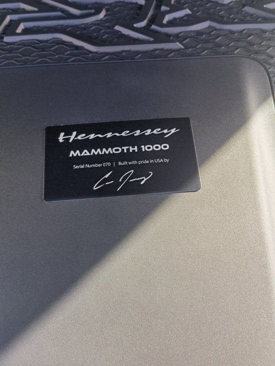 加装升级:(升级高流量增压器、升级增压器前后驱动滑轮、升级重曲轴避震器、升级温控器、升级火花塞、高速流量过滤器、曲轴箱通风系统、HPE ECM校准升级、密封垫和流体专业安装、底盘功率计测试、道路测试、轩尼诗刺绣头枕、轩尼诗外部落款、猛犸象1000外部徽章、发动机舱猛犸象限量标牌 、猛犸象定制前LED后保险杠 20寸轩尼诗轮 37英寸越野胎 升级的电子折叠台阶 轩尼诗水平套件)