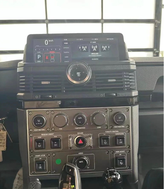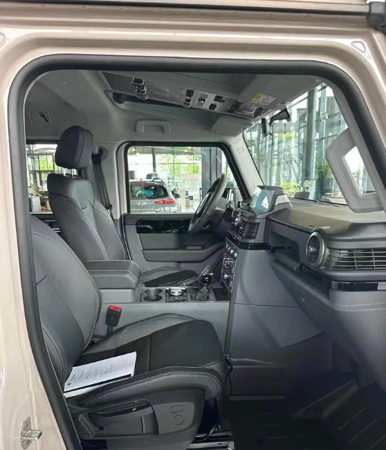 内饰布局:总体延续老款卫士布局,借鉴两幅式方向盘、中控区域长方形出风口(中间嵌入指南针液晶表盘)、机械按键、副驾抓手设计等元素,此外车辆还新增部分越野配置,如副驾A柱抓手等。掷弹兵采用复古机械设计,仪表板两侧设圆形出风口,配备宝马鸡腿电子档杆,其左侧为传统手刹,右侧为分动箱挡杆,手刹旁多功能旋钮则控制不同功能选择(包括选择键、菜单键、返回键、音响键、音频键、越野键,类似宝马多功能旋钮)。