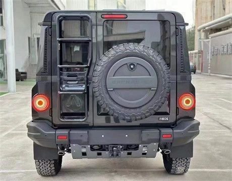 英力士掷弹兵3.0车尾部分,圆形尾灯和尾梯等元素同样经典,裸露的后挂备胎展现硬核气质,粗壮的后包围提供拖车钩和大尺寸的保护底板,排气系统采用双边共双出圆形排气。圆形的尾灯与头灯相呼应,后杠看起来也十分粗壮,符合其越野车的定位。采用了大面积的黑色防护护板,既美观又实用。左侧还配备了攀爬梯子,底部依然采用左右双拖车勾,离去角度很大,整体非常硬派。