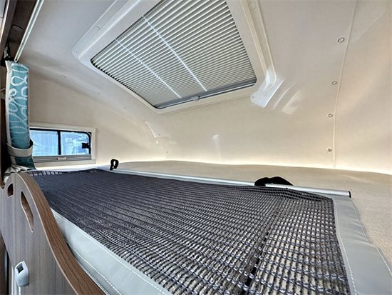 卧室区采用纵置床铺设计,可以同时满足两个成年人在这里休息。床铺还配有高密度的海绵床垫,能够为乘客提供更舒适的睡眠体验。整个卧室区显得极为精致,配置设计也比较齐全,上方设计了多个储物吊柜和半开放式储物格,可以收纳较多的衣物。睡觉时还可以将隐私帘拉上,为乘客提供更好的独立休息空间。