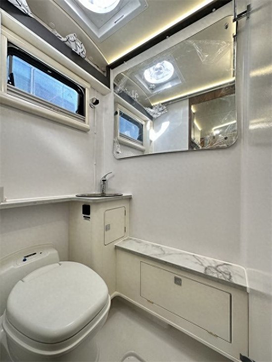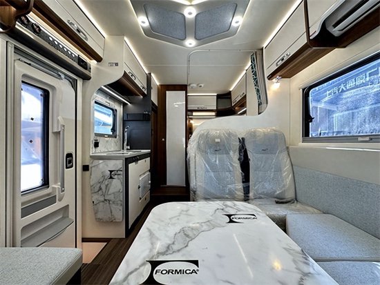 客休区的布局基本和传统房车一样采用,L 型的卡座沙发搭配轿车式的沙发造型,凸显品质。副驾驶的座椅支持角度旋转,与客休区形成更大的交流区,闲适洽谈、悠适生活,瑞弗的客休区的沙发与大多是房车不同它是个体的更倾向与MPV车型的座椅更符合人体工程学,乘坐更舒适,安全系数也相对更高。中间的课桌采用大理石面板的造型,更显高级,配备一个大面积的推窗,旅行中靠着沙发看着窗外的风景惬意的前往下一站。