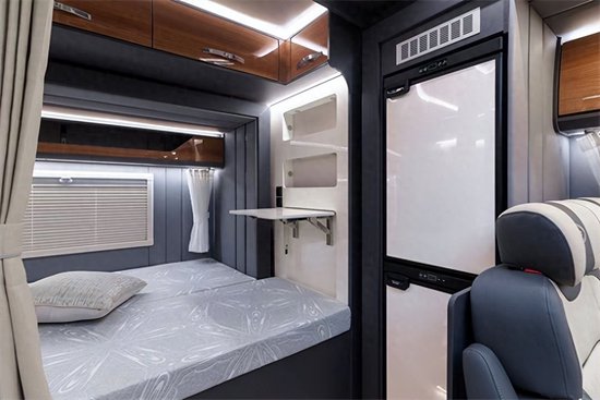 车内采用简约时尚的风格设计,特别适合中青年人群。驾驶舱上方的额头床区域,空间容积还是比较大的,可以满足两个成年人在这里休息。另外额头床配有三个外推窗,能够更好的为额头床区域进行通风和透光。在副驾驶后方则设计了小吧台,上车后可以将包包钥匙或鞋子收纳到这个位置。