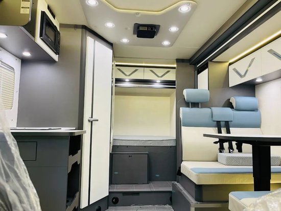 电气集控面板设计在进门的右侧操作简单方便,其下方是车辆的锂电仓。家用空调安装在车门上方, 厨房区域包含组合式橱柜+厨房吊柜房车专用带盖水槽以及微波炉、142L塞特福德房车专用直流冰箱应有尽有。电路配置为:12V800AH磷酸铁电池+12V3000W充逆变一体机+12V180A+12V150A的前车双发电机,搭配1000W太阳能板,出行无忧。