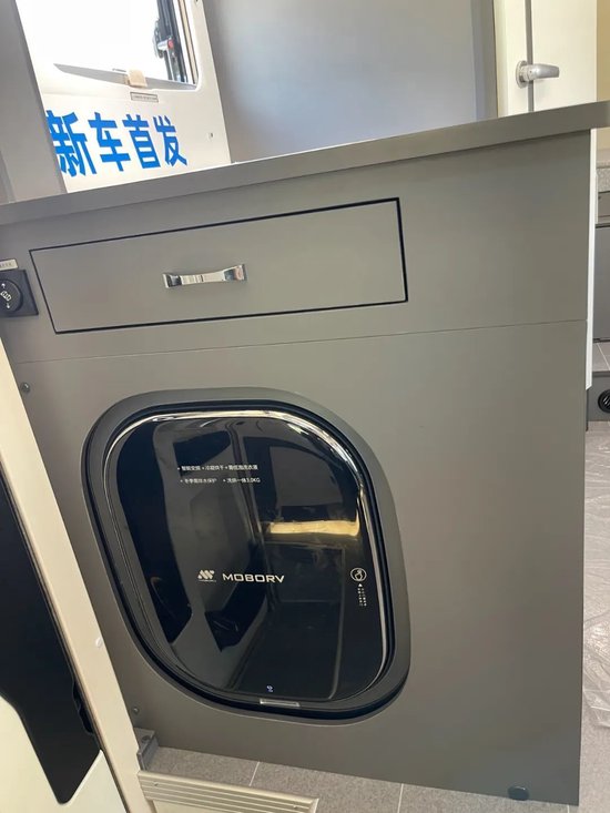 洗手间区域位于厨房区域后方其内部配备了房车专用抽拉马桶淋浴系统、卫生间换气扇、陶瓷面盆、储物柜、淋浴花洒等配置,在进门的右侧是3KG的洗烘一体洗衣机。水电配置:200L清水箱+35L灰水箱,可以满足一家人出行需要。
