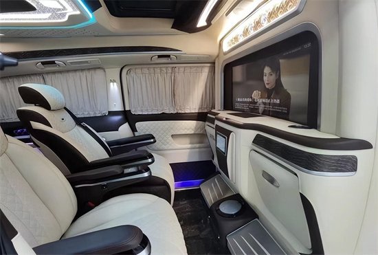 前后舱采用全隔断设计,大屏升降电视驾驶舱与乘客舱均可控制升降,为重要商务洽谈提供完美私密空间。屏幕上方是一个经典航空钟表,造型新颖别致,下方是一个空气净化器的配置,为封闭车内空间提供新鲜空气,完美保障车内空气流通。