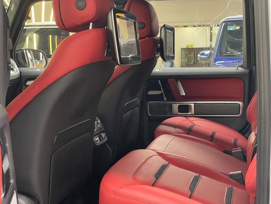 23款奔驰G63 (配置|询价)内饰方面,奔驰的设计绝对可以用惊艳来形容,无论是经典车型还是超豪华车型甚至是入门级的豪华车上,奔驰的内饰都会让你眼前一亮,当然了这也是奔驰的一个特色。所以这部全新的G63在内饰的表现上也是情理之中的,但是细节上还是有些小小的意外。这种感觉是打开车门的瞬间就能够感受到的。首先仪表和中控屏依旧是采用了同一款液晶屏显示,第一感觉就是科技感爆表。而其他方面例如方向盘,空调出风口,挡杆等等的设计充满设计感。