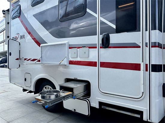 厨房区域配置齐全,格兰仕微波炉、抽油烟机、操作台电磁炉、带折叠水龙头的洗菜池等的设计。橱柜的转角部分采用弧形设计,并转化为储物空间,锅碗瓢盆好去处。加上外置厨房,满足您的房车烹饪毫无压力。