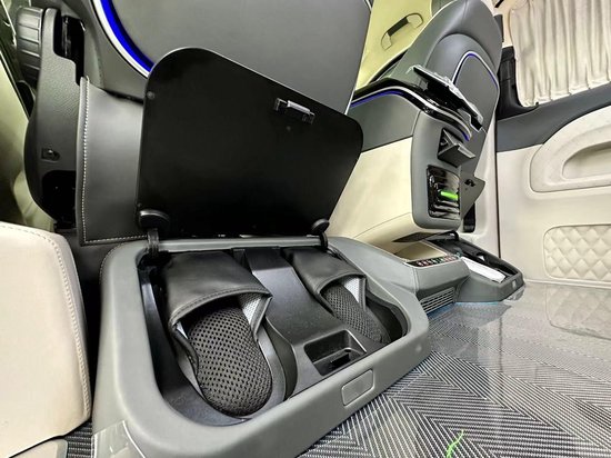 商务舱的内饰装修的也相当的不错,驾驶舱靠背的小桌板带我们到氛围灯,还有杯托以及无线充电的功能。顶部吸顶的电视机也是一个网络电视机,连接车载Wi-Fi无线热点都可以使用,而且全车吏部都做了真皮的包覆,从顶不到门板到座椅,覆盖到方方面面。非常就特色化的一点东西是我们的休息脚踏打开之后,他竟然带了足底按摩,坐在车里困了累了,那来一个舒适的按摩,可以缓解疲劳后面USB的接口220伏的充电线以及触控屏的控制,也都选用的是非常经典的款式。