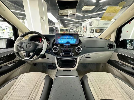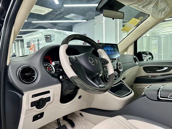 奔驰威霆是2.0T高功率的一个发动机马力达到211匹。所以他行驶的过程中动力是不用担心的,不管是超车,还是变道都能够很好地做出反应。了解过威霆裸车的朋友都知道,那是相当的简陋,通过后期升级改装之后,车里面的内饰也是相当的奢华,如果两款车对比在一起完全看不出来是同一类车型,这一台的驾驶室做的是桃木的方向盘,悬浮屏的中控,以及中央扶手冰箱都有再安排上。而且在忠厚的位置也前面做了一个真皮的包覆,就连脚底下脚踩的位置都有包覆。他四层的门板上也单独做了调节下层的两个座椅同色系的一个包覆之外,也带有电动的调节。