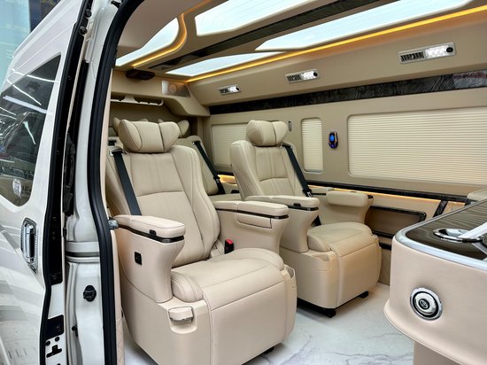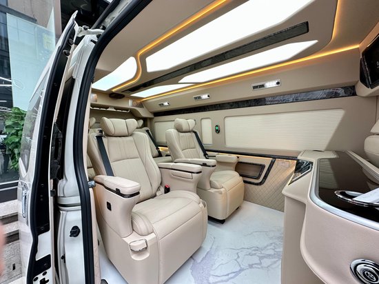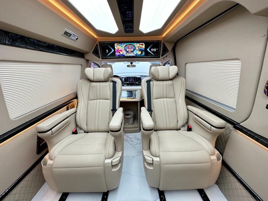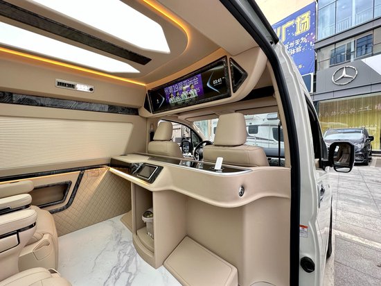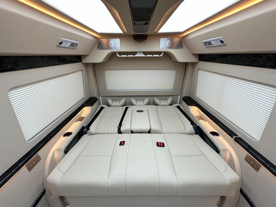 整车车内饰米色为主,作为一款商务车,米色内饰一向是人们所钟爱的一款,与其相匹配的是侧墙也是米色包覆,还有电动的百褶窗帘,地板也是大理石的递盘,浅色内饰看起来很舒心,顶部是多款颜色可以调节的顶灯,没有太花哨的颜色,有的是温馨,稳重的款式。